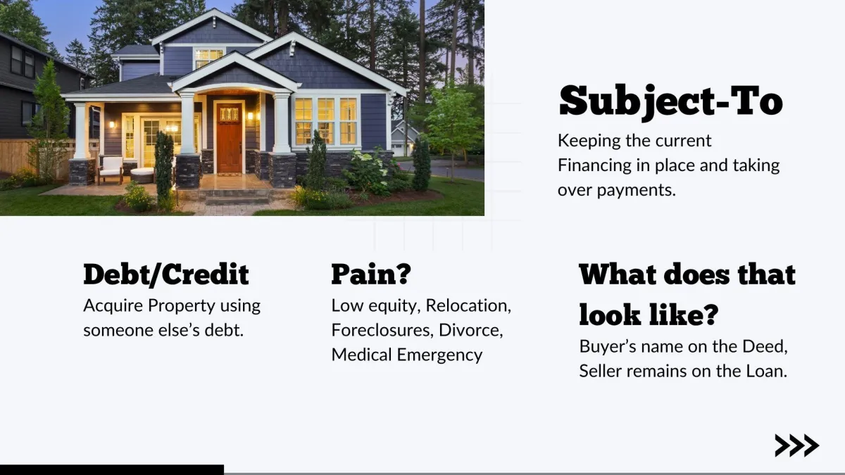 This is a way of owning something while utilizing someone else's existing debt. For a home, it will look like taking over the mortgage payments on the owner's behalf.