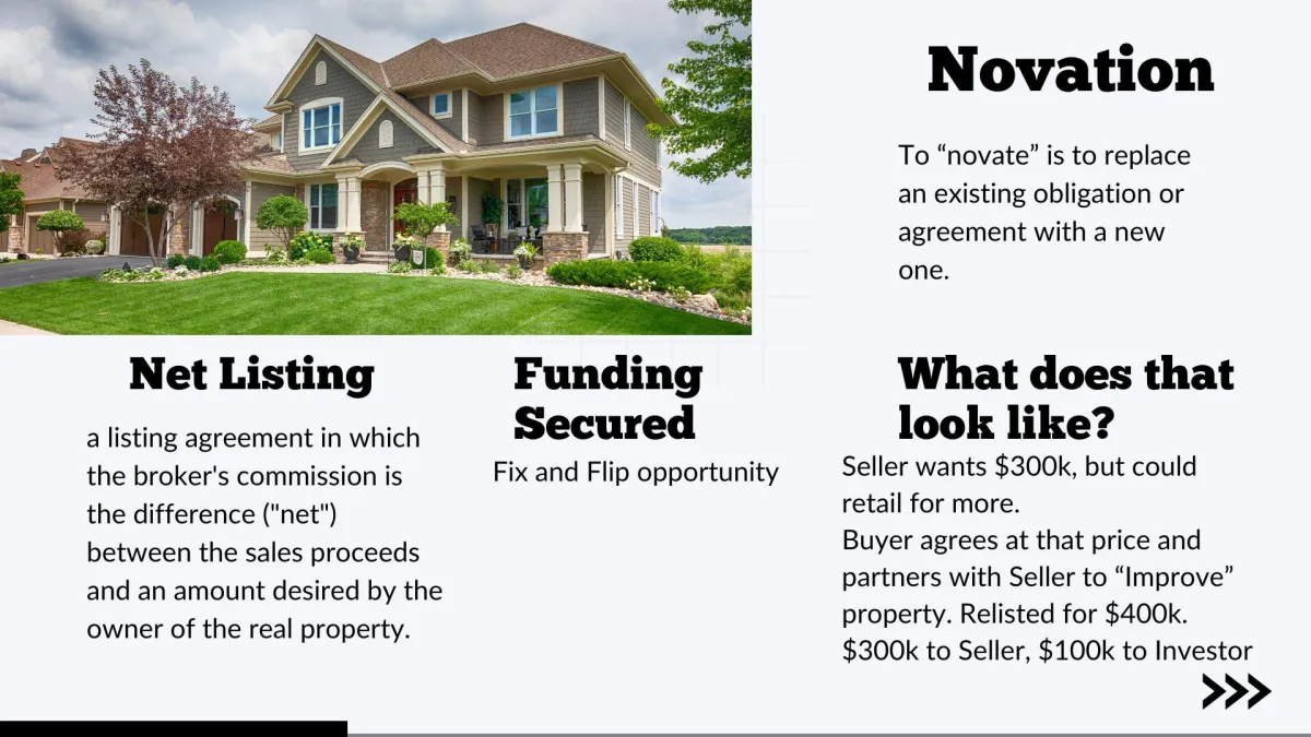 This is an agreement with the property owner where we put the property in a "market ready" condition, and compensation is settled after the project is finished and sold, rather than before.